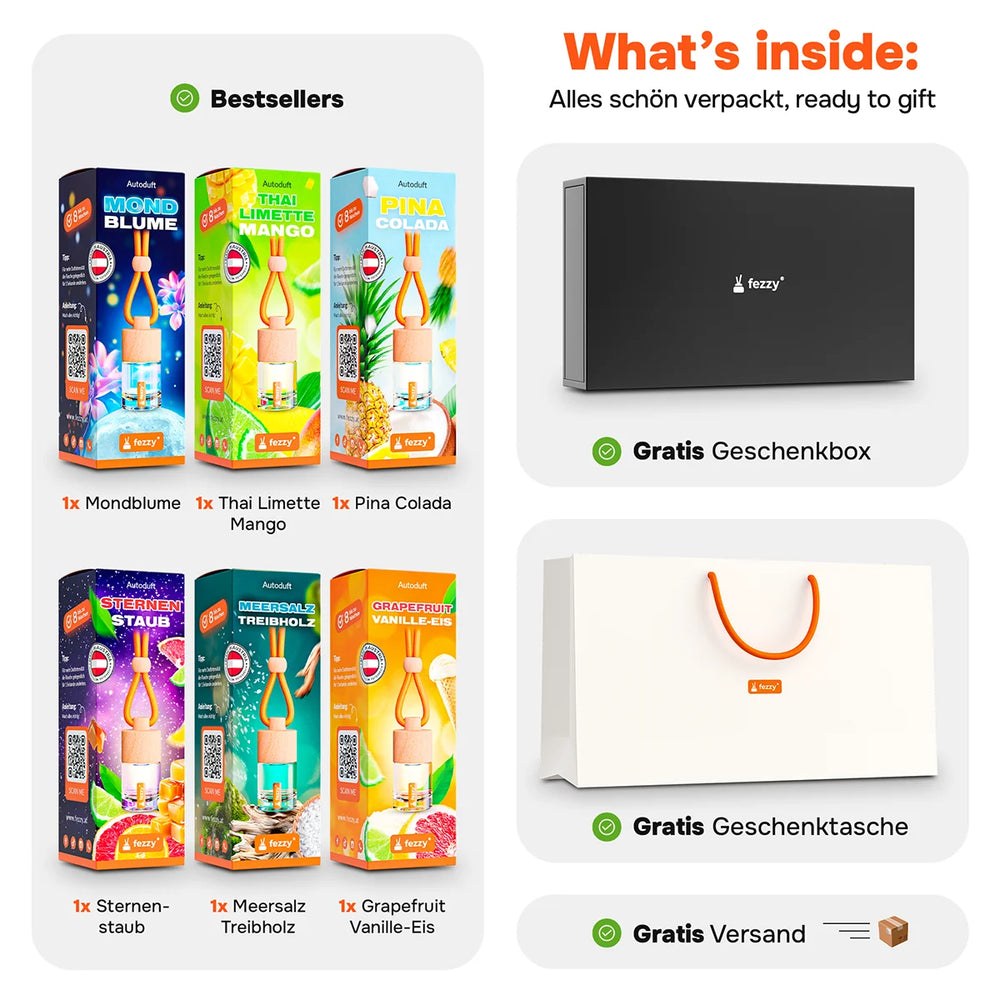 6x Fezzy Autodüfte à 8 ml + Geschenkbox + Geschenktasche